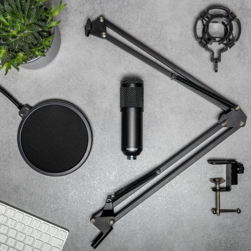Mikrofon si díky ohebnému husímu krku nastavíte tak, abyste se během mluvení cítili pohodlně. Součástí mikrofonu je flexibilní stojan s maximální délkou až 77 cm. Pomocí nastavitelné svorky ho také můžete připevnit ke stolu o síle desky až 45 mm. Odpružený držák vám zajistí stabilní umístění mikrofonu Niceboy. Přenos zvuku neruší žádné vibrace či otřesy. Pop filtr a protivětrný kryt navíc snižuje míru nárazů zvuku na mikrofon, které vznikají při vyslovování některých hlásek.