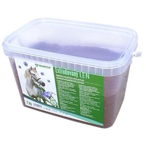 Extrudovaný len s pšeničnou otrubou. Doplňkové energetické krmivo vhodné pro koně v zátěži, pro březí klisny před hřebením, v období přelínání srsti a u koní trpícími častými kolikami. Pro zlepšení kvality srsti. Lněné semínko chrání před laminitidou, zlepšuje zdraví srdce a cév a zmírňuje alergických onemocnění kůže (vhodné podávat při letní vyrážce). Pšeničné otruby obsažené v krmivu působí dieteticky a velmi příznivě na činnost trávicího traktu koní. Složení: lněné semeno (70%), pšeničné otruby (30%). Analytické složky: hrubý protein: 19 %, tuk a olej: 26 %, hrubá vláknina: 7,5 %, hrubý popel: 4,2 %. Dávkování: 150 g/kus a den. Určeno pro přímé zkrmování nebo výrobu krmných směsí. Extrudovaný len se nespařuje ani nevaří pouze se nasype do krmení.