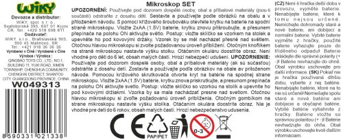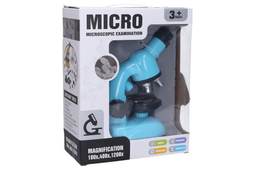 Mikroskop. Velikost 21 cm. Zvětšení 10x, 400x, 1200x. Baterie 2xAA není součástí. Obsahuje mikroskop, držák na mobilní telefon, sadu sklíček, krabičku na sklíčka, pinzetu, misky a lahvičky. Možnost připevnit držákem mobilní telefon a fotit zvětšené vzorky.