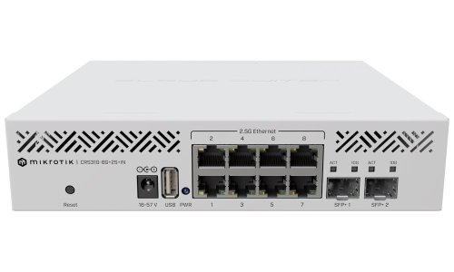 Výkonný Cloud Router Switch s osmi 2,5GbE RJ-45 porty a dvěma 10G SFP+ sloty. Tento přepínač dokáže využít plný potenciál systému RouterOS v7: provozovat sítě VLAN, rámce Jumbo, agregaci linek, pravidla ACL a mnoho dalšího.