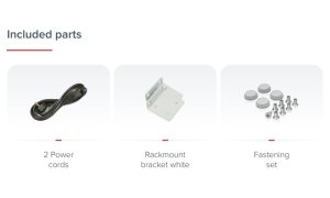 Balení obsahuje: Cloud Core Router CCR2004-16G-2S+ určený pro montáž do racku (1U), dva napájecí kabely a rackmount kit.