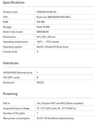 Z podporovaných funkcí a vlastností: • 8x SFP+ ports • 1x management Ethernet port with PoE • Switching capacity: 162 Gbps • Maximum power consumption: 19 W (with attachments 33 W) • Supports PoE+ IEEE 802.3at/af and passive PoE 18-57 V • Metal enclosure • Fanless