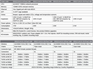CPU: QCA9557 720MHz network processor Memory: 128MB DDR2 onboard memory Ethernet One Gigabit port with Auto-MDI/X SFP: 1x SFP cage available Extras: Beeper, signal and status LEDs, voltage and temperature sensors Expansion: USB 2.0 port, 1x MiniPCIeslot, SIM slot (requires 3gminiPCIe card) Power options PoE-in: 8-30V DC on Ether1 (Non 802.3af) Consumption: 17W Dimensions: 143x247x48mm; Weight: 865g OS: MikroTik RouterOS, Level4 license, free product lifetime upgrades Wireless: QCA9882 5GHz 802.11ac Chains: Dual chain Connector: 2x RP-SMA Female (outside thread) Kit includes: