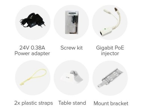 Jednotky disponují integrovaným PoE splitterem pro PoE napájeni po UTP kabelu, také podporují standard 802.3af/at. Součástí dodávky napájecí zdroj, PoE injektor, držák, instalační pásky a bezpečnostní šroub eliminující neoprávněné vniknutí do zařízení.