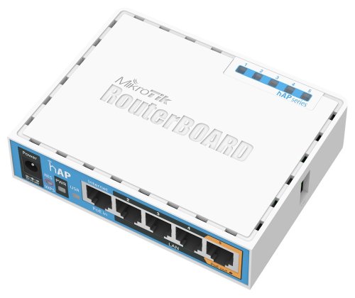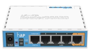 MikroTik hAP je kompaktní síťové zařízení určené pro domácnosti a malé kanceláře, kde potřebujete spolehlivý bezdrátový přístup a několik kabelových připojení. Vychází z osvědčeného modelu RB951-2n a přináší vylepšení v mnoha oblastech. Zařízení je vybaveno dual-chain 2.4 GHz Wi-Fi s podporou standardů 802.11b/g/n a maximální rychlostí 300 Mbit/s.
