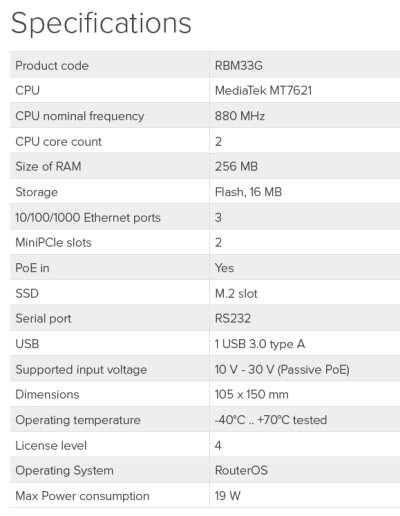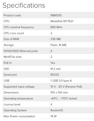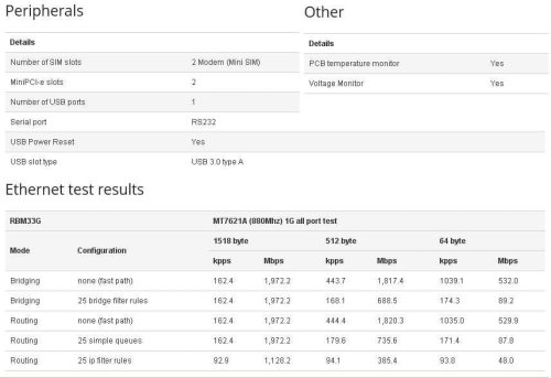 RBM33G je vybaven 3x Gbit ethernetovými porty, první port podporuje napájení pasivním PoE v rozsahu 10-30 V. Hlavní předností RouterBoardu jsou dva PCIe sloty a dva sloty pro SIM, je tak možné desku osadit dvěma LTE modemy, případně kombinaci LTE modemu a Wi-Fi karty.