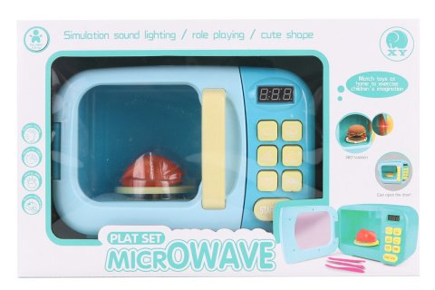 Mikrovlnná trouba na baterie. Plastová trouba na baterie. Napájení na 2x AAA baterie (nejsou součástí). Trouba vydává reálné zvuky a svítí stejně jako při ohřívání, točí se jí vnitřní část. Balení obsahuje plastové kuře, sendvič, donut, koláč, volské oko, 2 talíře a příbor. Trouba o velikosti 23 x 15 cm. Rozměry balení cca 34,5 x 22 x 12,5 cm. Věk 3+
