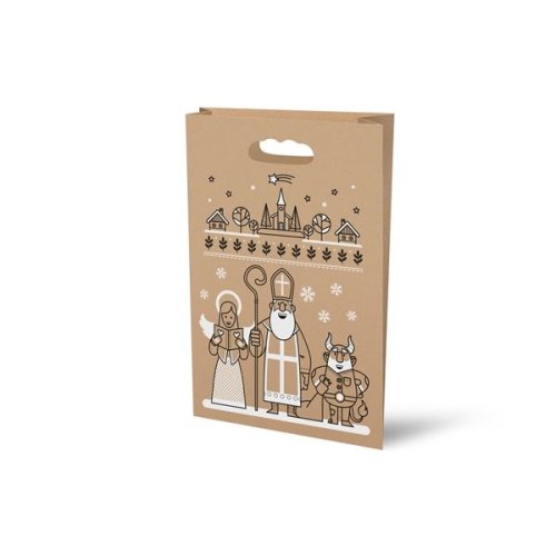 Dárková papírová taška s průhmatem a černobílým potiskem Mikuláše, anděla a čerta Ideální na vytváření čokoládových balíčků nejen pro děti Materiál: hnědý papír 85 g Rozměr: 26 x 41 x 11 cm