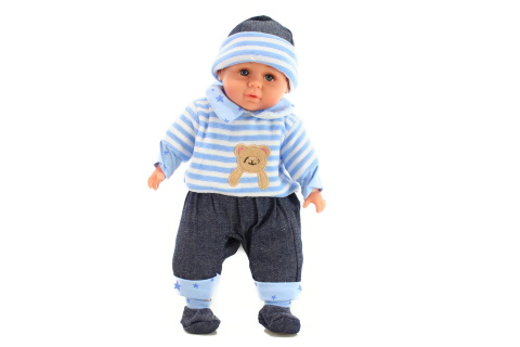 Miminko s měkkým tělíčkem. Miminko je oblečeno do barevného pyžámka, které lze sundat (suchý zip). Rozměry miminka cca 35 x 17 x 8 cm. Baleno v plastovém sáčku. Věk 3+