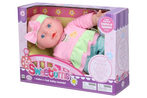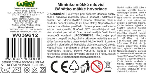 Miminko měkké mluvící. Velikost 28 cm. Součástí láhev. Stlačením levé dlaně říká "máma", stlačením pravé dlaně říká "táta", stlačením hrudníku říká "I love you" a směje se. 3xAG13 baterie součástí. 3 varianty.