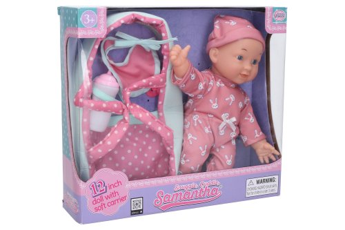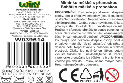 Miminko měkké s přenosnou taškou. Velikost 30 cm. Obsah - miminko, přenosná taška, bryndák, láhev. 2 varianty - růžová, bílá.