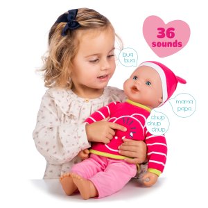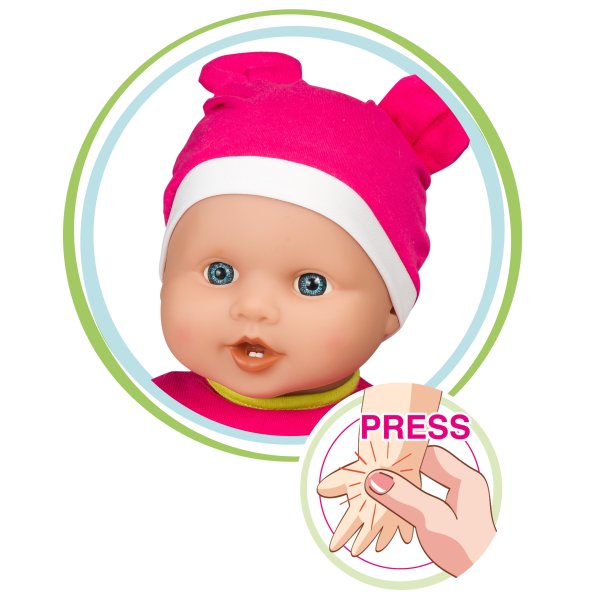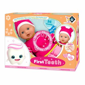 Miminko mluvicí rostoucí zuby 45cm. Miminku se stlačením ruky vysunou zoubky. Měkké tělíčko, stlačením tlačítka na hrudi vydává zvuky. Celkem 36 různých zvuků. Baterie 3xLR44 součástí.
