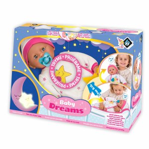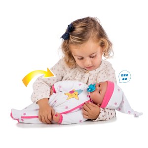 Miminko mrkací se zvuky. Velikost 40cm. Při položení na záda zavře oči. měkké tělíčko. Houpáním v náručí začne vydávat zvuky. Stlačením tlačítka na hrudi mluví.