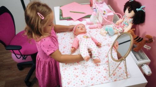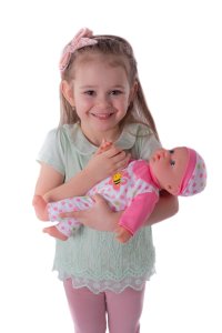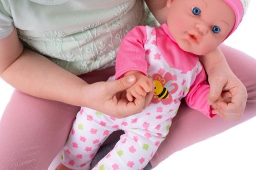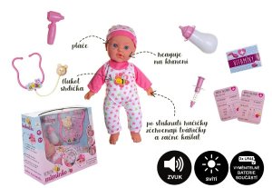 Nemocné miminko, které potřebuje pomoc od malých maminek či budoucích lékařek. K tomu jsou potřeba zdravotnické potřeby, které sada obsahuje. Panenka má měkké tělo a je se zvukem a světlem. Po stisknutí ručičky jí zčervenají tvářičky a začne kašlat. Přilož stetoskop na srdíčko a uslyšíš jeho tlukot. Po injekci začne miminko plakat. Dej miminku lahvičku do pusinky a poslouchej, jak pije. Uzdrav svoje miminko. Balení obsahuje stetoskop, injekční stříkačku, kukátko do uší, lahvičku, krabičku s nápisem VITAMÍNY a kartu pacienta. Panenka je velikosti 36 cm. Baterie 3x AG13 jsou součástí balení a slouží pouze pro předváděcí účely, doporučujeme baterie vyměnit za nové. Rozměry balení 37 x 31 x 17 cm Vhodné pro děti od 3 let