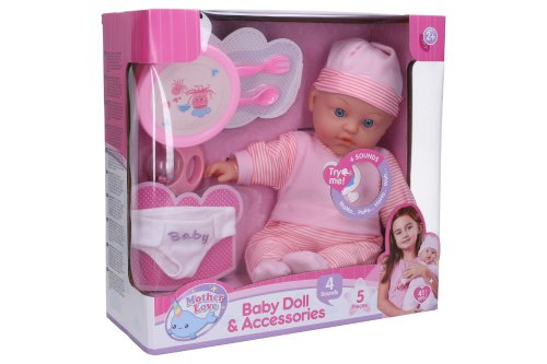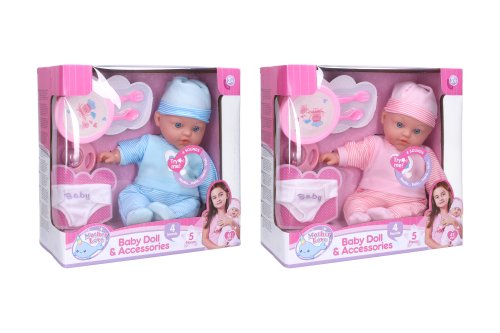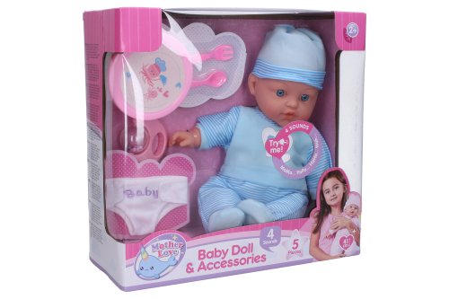 Miminko se zvuky a doplňky. Velikost 41 cm. Balení obsahuje miminko, talířek s vidličkou a lžičkou, chrastítko a plenku. Po stlačení bříška vydává zvuky: říká mama, papa, směje se, žvatlá. Měkké tělíčko. 2 varianty - růžová, modrá.