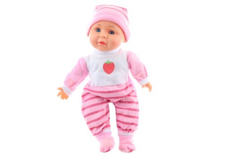 Miminko s měkkým tělíčkem. Po stlačení tělíčka začne miminko vydávat zvuky (smích, pláč, mama, tata). Miminko je oblečeno do barevného pyžámka, které lze sundat (suchý zip). Rozměry miminka cca 30 x 15 x 6 cm. Baleno v plastovém sáčku.Provoz na 3 knoflíkové baterie. Věk 3+