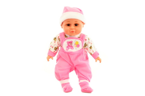 Miminko s měkkým tělíčkem. Po stlačení tělíčka začne miminko vydávat zvuky (smích, pláč, mama, tata). Miminko je oblečeno do barevného pyžámka, které lze sundat (suchý zip). Rozměry miminka cca 30 x 15 x 6 cm. Baleno v plastovém sáčku.Provoz na 3 knoflíkové baterie. Věk 3+