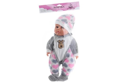 Miminko s měkkým tělíčkem. Po stlačení tělíčka začne miminko vydávat zvuky (smích, pláč, mama, tata). Miminko je oblečeno do barevného pyžámka, které lze sundat (suchý zip). Rozměry miminka cca 30 x 15 x 6 cm. Baleno v plastovém sáčku.Provoz na 3 knoflíkové baterie. Věk 3+