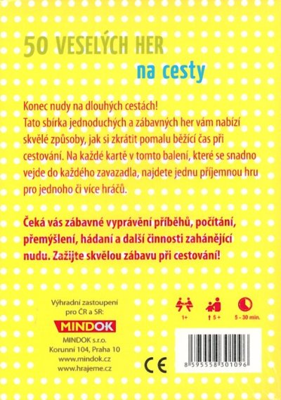 Tato sbírka jednoduchých a zábavných her vám nabízí skvělé způsoby, jak si zkrátit pomalu běžící čas při cestování. Na každé kartě v tomto balení, které se snadno vejde do každého zavazadla, najdete jednu příjemnou hru pro jednoho či více hráčů. Čeká vás zábavné vyprávění příběhů, počítání, přemýšlení, hádaní a další činnosti zahánějící nudu.