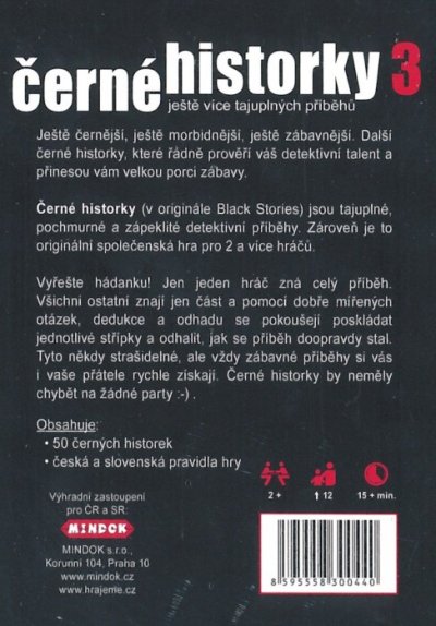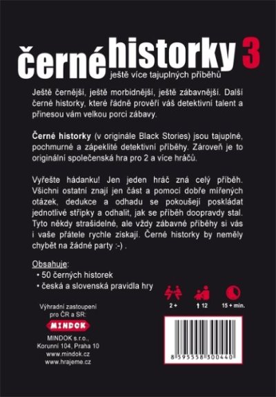 Vyřeště hádanku! Jen jeden hráč zná celý příběh. Všichni ostatní znají jen část a pomocí dobře mířených otázek, dedukce a odhadu se pokoušejí poskládat jednotlivé střípky a odhalit, jak se příběh doopravdy stal. Tyto někdy strašidelné, ale vždy zábavné příběhy si vás i vaše přátele rychle získají. Černé historky by neměly chybět na žádné párty!
