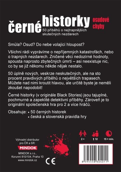 50 příběhů o nejtrapnějších skutečných nezdarech. Smůla? Osud? Do nebe volající hloupost? Všichni rádi vyprávíme o nepříjemných katastrofách, nebo o trapných nezdarech. Zničené věci nedozírné hodnoty, spousta naprosto zbytečných úmrtí – asi neexistuje nic, co by se již někomu někde nějak nestalo. 50 úplně nových, veskrze neskutečných, ale na sto procent pravdivých příběhů o největších trapasech. Můžete nad nimi kroutit hlavou, ale určitě byste je neměli zkoušet napodobit! Černé historky (v originále Black Stories) jsou tajuplné, pochmurné a zapeklité detektivní příběhy. Zároveň je to originální společenská hra pro 2 a více hráčů. Pravidla hry: Jeden hráč zná celý příběh. Všichni ostatní znají jen část pomocí dobře mířených otázek, dedukce a odhadu se pokoušejí poskládat jednotlivé střípky a odhalit, jak se příběh doopravdy stal. Hra obsahuje: 50 černých historek, pravidla hry