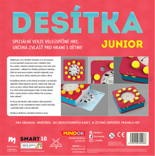 Oblíbili jste si hru Desítka? Tentokrát se k vám dostává ve verzi speciálně určené pro hraní s mladšími hráči. Hra vychází z důvěrně známých principů a lze ji hrát zcela samostatně – základní hru Desítka potřebovat nebudete. Čeká vás nová porce otázek a možných odpovědí, nové výzvy, nová porce zábavy zejména pro rodiny s dětmi. Ke každému okruhu ve hře přísluší 10 otázek a 10 možných odpovědí. Pokud odpovíte správně, získáte bod. Když jste znovu na tahu můžete hledat další správnou odpověď. V tu chvíli ovšem podstupujete riziko, že body získané dříve v tomto okruhu ztratíte. Budete hrát na jistotu, nebo riskovat? Ve hře je 200 okruhů, 2000 otázek a 2000 správných odpovědí. To vše v kompaktním balení zvaném Smartbox s počítadly bodů a žetony odpovědí. Desítka je skvělá hra, obzvláště vhodná na cesty. Balení obsahuje: smartbox, 100 oboustranných karet, 10 žetonů odpovědí, pravidla hry Vhodné pro děti od 8 let.