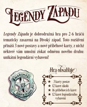 Legendy Západu je dobrodružná hra pro 2–6 hráčů tematicky zasazená na Divoký západ. Toto rozšíření přináší 3 nové postavy a nové příběhové karty, z nichž některé vám umožní získat odměnu nového druhu: unikátní legendární vybavení! Balní obsahuje: