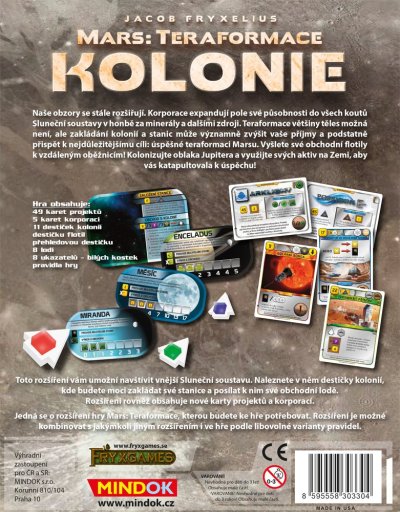 Naše obzory se stále rozšiřují. Korporace expandují pole své působnosti do všech koutů Sluneční soustavy v honbě za minerály a dalšími zdroji. Teraformace většiny těles možná není, ale zakládání kolonií a stanic může významně zvýšit vaše příjmy a podstatně přispět k nejdůležitějšímu cíli: úspěšné teraformaci Marsu. Vyšlete své obchodní flotily k vzdáleným oběžnicím. Kolonizujte oblaka Jupitera a využijte svých aktiv na Zemi, aby vás katapultovala k úspěchu. Jedná se o rozšíření pro zkušené hráče hry Mars: Teraformace, ke hraní budete potřebovat i základní hru. Rozšíření je možné kombinovat s jakýmkoli jiným rozšířením i hrát podle libovolné varianty pravidel. Balení obsahuje: