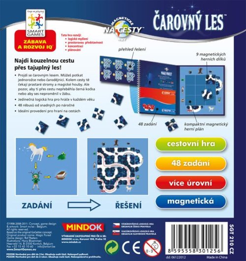 Hrejte si i na cestách. Zadání, herní plán i řešení jsou spojeny kroužkovou vazbou a uzavřeny v plastovém obalu. Celá hra je navíc magnetická, nemusíte se proto bát, že Vám dílky budou při hře sjíždět. Projdi se čarovným lesem. Můžeš potkat jednorožce nebo čarodějnici. Kolem cesty tě čekají prastaré stromy a magické houby. Ale pozor, aby ti přes cestu nepřeběhla černá kočka nebo aby ses neproměnil v žábu. Hra Čarovný les patří do skupiny víceúrovňových, logických her Smart games , které jsou určeny především pro jednoho hráče (nicméně hru může hrát i hráčů více). Logické hry Smart Games obsahují vždy zadání v několika různých stupních obtížnosti, rozvíjí IQ, logické myšlelní, prostorovou představivost, koncentraci a plánování.
