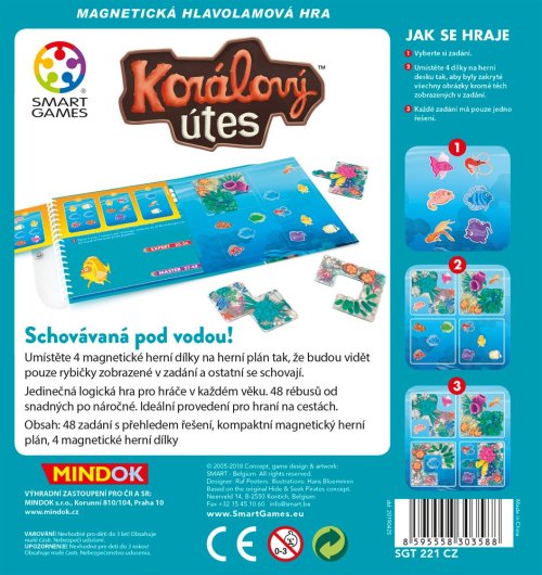 Schovávaná pod vodou! Umístěte 4 magnetické herní dílky na herní plán tak, že budou vidět pouze rybičky zobrazené v zadání a ostatní se schovají. Jedinečná logická hra pro hráče v každém věku. 48 rébusů od snadných po náročné. Ideální provedení pro hraní na cestách. Balení obsahuje: