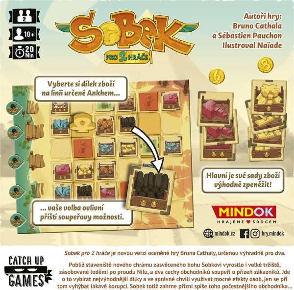 Poblíž staveniště nového chrámu zasvěceného bohu Sobkovi vyrostlo i velké tržiště, zásobované loděmi po proudu Nilu, a dva cechy obchodníků soupeří o přízeň zákazníků. Jde o to vybírat nejvýhodnější dílky a ve správné chvíli využívat mocné efekty osob, jen se při tom vyhýbat lákavé korupci. Sobek totiž zahrne přízní spíše toho počestnějšího obchodníka… Hra obsahuje: 1 tržiště (herní plán), 2 desky korupce, 55 dílků zboží, 10 dílků postav, 13 žetonů lodiček, 1 sáček, 13 žetonů debenů, 1 dřevěný Ankh, 2 přehledové listy, pravidla hry Vhodné pro děti od 10 let.