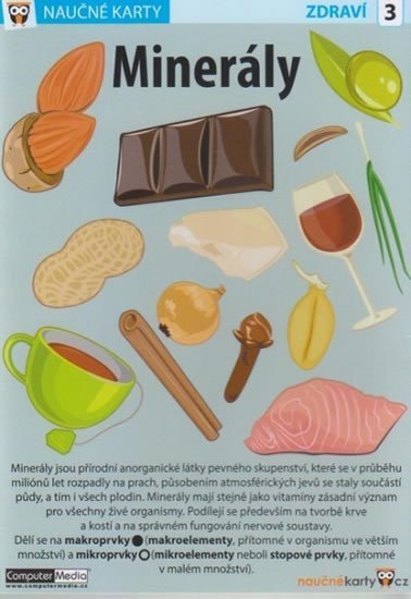 O minerálech platí totéž, co o vitamínech – jsou pro fungování organismu nezbytné. Přehled minerálů má obdobnou strukturu jako díl o vitamínech: výčet prvků, jejich úloha, zdroje, doporučené denní dávky apod., to vše doplněno pěknými a snadno zapamatovatelnými ilustracemi. Naučné karty jsou moderní formou poznávání pro všechny generace. Přinášejí stručný, výstižný a zajímavý přehled nejdůležitějších informací z odborných i zájmových oblastí. Nejen texty, ale i názorné ilustrace a fotografie, promyšlené grafické zpracování a praktický formát osloví ty, kteří se chtějí nejen vzdělávat, ale i bavit.