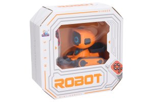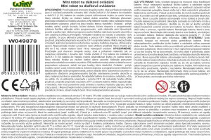 Mini robot RC na dálkové ovládání. Rozměry 7,5x12x9,5 cm. Infračervený port. Světelné a zvukové efekty. 4xAG13 baterie do robota součástí, 2xAAA do ovladače není součástí. Ovladač - ON/OFF tlačítko, programovací tlačítko, chůze všemi směry.