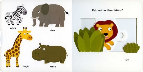 Objevovat svět divokých zvířat s tímto leporelem pro nejmenší děti od jednoho roku je tak zábavné! Pevné stránky s pohyblivými prvky procvičí i jemnou motoriku. Je myška velká a žirafa malá? Nebo je to přesně naopak? Co je nahoře a co dole? Která žížala je dlouhá? Která krátká? Spí pejsek právě teď uvnitř boudy, nebo běhá venku? Stačí jen vložit prstík do správného otvoru a lehce vysunout, zatáhnout nebo otočit ve směru šipky a hned bude váš malý objevitel znát odpovědi. Leporelo je určeno pro nejmenší děti od jednoho roku a má pevné stránky s posuvnými a otočnými prvky, a tak si naši nejmenší mohou při prohlížení a rozeznávání protikladů procvičit i jemnou motoriku. Knížka s prvky Montessori. České vydání publikace nakladatelství Nathan. Počet stran: 10 Vazba: Leporelo Rok vydání: 2017 ISBN: 978-80-256-1883-7 Ilustrační video