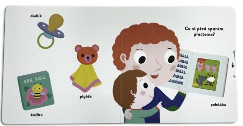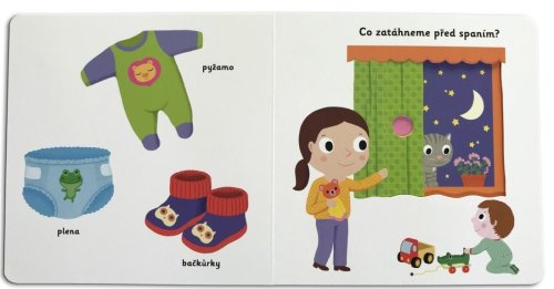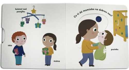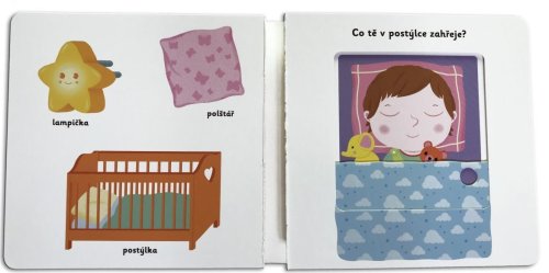 Objevovat, co všechno lze vidět v dětském pokojíčku před spaním, je s tímto leporelem tak zábavné! Co si před spaním přečteme? A co ti dá maminka na dobrou noc? Stačí jen vložit prstík do správného otvoru, lehce posunout nebo otočit ve směru šipky a hned bude váš malý objevitel nebo objevitelka znát odpovědi. Leporelo je určeno pro nejmenší děti od jednoho roku a má pevné stránky s posuvnými prvky, a tak si naši nejmenší mohou při prohlížení a pojmenovávání procvičit i jemnou motoriku. Knížka s prvky Montessori. České vydání publikace nakladatelství Nathan.