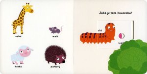 Je myška velká a žirafa malá? Nebo je to přesně naopak? Co je nahoře a co dole? Která žížala je dlouhá? Která krátká? Spí pejsek právě teď uvnitř boudy, nebo běhá venku? Stačí jen vložit prstík do správného otvoru a lehce vysunout, zatáhnout nebo otočit ve směru šipky a hned bude váš malý objevitel znát odpovědi. Leporelo je určeno pro nejmenší děti od jednoho roku a má pevné stránky s posuvnými a otočnými prvky, a tak si naši nejmenší mohou při prohlížení a rozeznávání protikladů procvičit i jemnou motoriku. Knížka s prvky Montessori. České vydání publikace nakladatelství Nathan.
