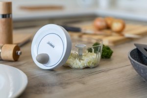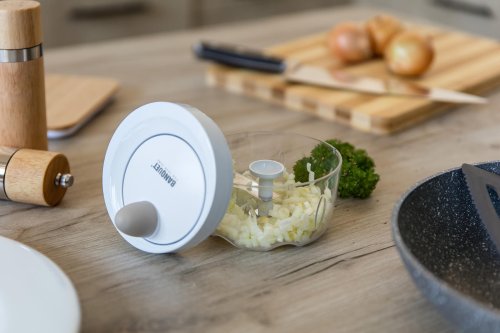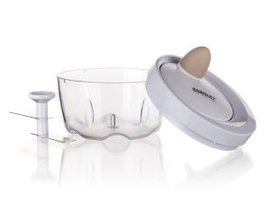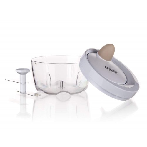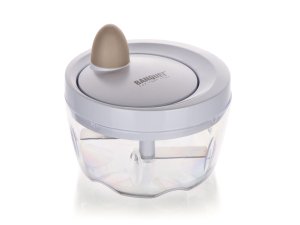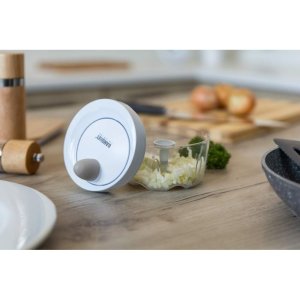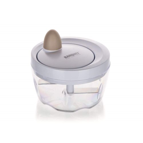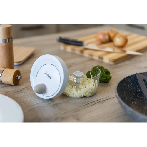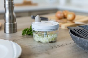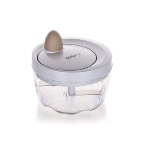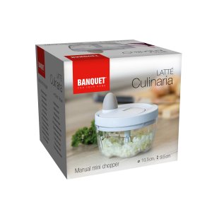 Ruční minisekáček CULINARIA Latte s plastovou transparentní miskou o průměru 10,5 cm a nerezovými noži. Ostré nerezové nože nasekají ovoce a zeleninu na malé kusy. Jednotlivé díly sekáčku se snadno udržují.