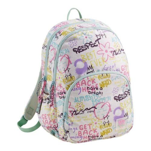 Moderní, lehký batoh v barevném motivu pro všechny teenage holky. Dělení na tři kapsy poskytuje dostatek prostoru pro školu a osobní drobnosti. Recyklovaný odolný materiál prodlužuje životnost, zesílené výztuhy zespodu chrání batoh před poškozením a znečištěním. •rozměry: 410 × 280 × 165 mm •materiál: recyklovaný polyester (rPET) •3 kapsy na zip, síťovaná kapsa na drobnosti •2 otevřené boční kapsy na láhev