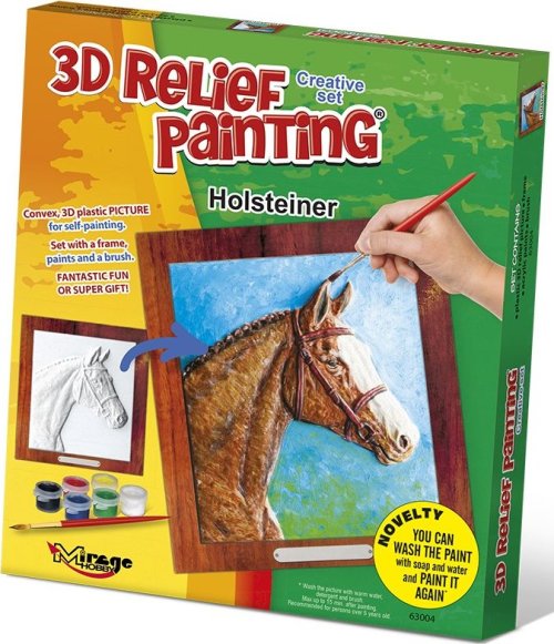 Sada obsahuje 3D plastový reliéfní obrázek 15x17 cm, papírový rámeček 19x21 cm, akrylové barvy (6 ks) a štětec.