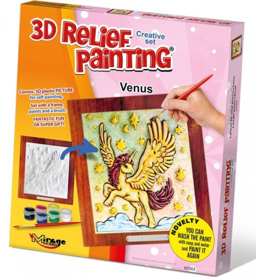 Sada obsahuje 3D plastový reliéfní obrázek 15x17 cm, papírový rámeček 19x21 cm, akrylové barvy (6 ks) a štětec.