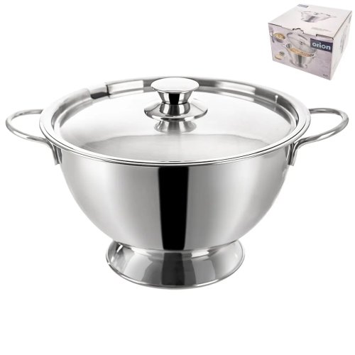 Polévková mísa s uchy s pokličkou na servírování polévek. V pokličce otvor pro naběračku. Materiál nerezová ocel 304 s/s. Objem 4.5 litru, průměr 26 cm, výška 15,5/18 cm. Lze mýt v myčce nádobí. EAN 8592381187736