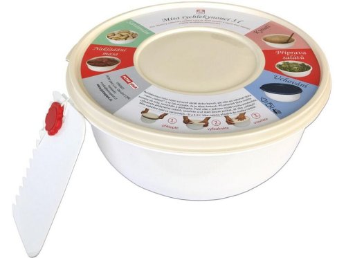 Plastová rychlekynoucí mísa s plným víkem na kynuté těsto, šlehání, míchání salátů apod. Zaděláte suroviny na těsto, přiklopíte víkem a odvzdušníte, poté, co víko odskočí, je vykynuté. Český výrobce. Barva víka dle skladové dostupnosti (bílá, žlutá, zelená, modrá, krémová, šedá). Objem 3 litry, průměr 24 cm a výška 12.5 cm. Součástí balení jsou 2 stěrky na těsto. Víko není vhodné do myčky nádobí. EAN 8590474906806