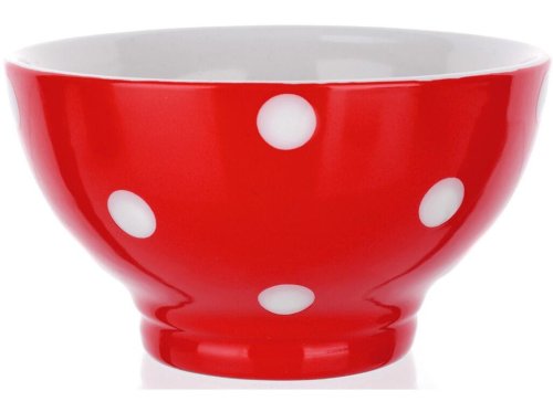 Červená miska s puntíky. Misku lze používat do mikrovlnné trouby a mýt v myčce na nádobí.