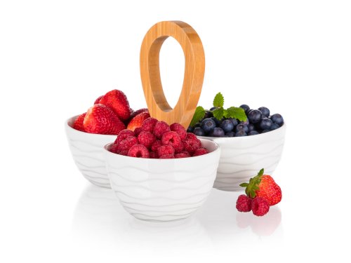 Tři kulaté dělené porcelánové misky, s bambusovým držákem, o celkových rozměrech 24 x 24 x 18,5 cm. Miska je ideální pro servírování různých druhů oříšků, sušeného ovoce, oliv apod.