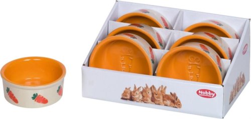 Keramická miska s obrázky mrkví po obvodu. Uvnitř misky plastický ornament mrkve. Velikost: průměr 10cm, výška 3,5cm, objem 150ml