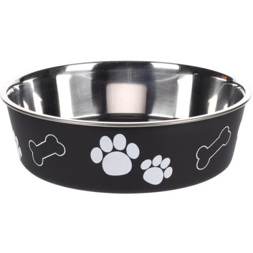 Odolná a hygienická nerezová miska je vhodná na suchou i mokrou stravu nebo vodu. Snímatelný gumový kroužek na spodní straně dna zabraňuje klouzání a tlumí hluk. Misku bez gumového kroužku lze mýt v myčce. Barva: černá s bílou tlapkou Objem: 800 ml