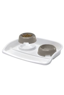 Dvě plastové misky s praktickým podnosem, objem misek 0,5 litrů. Vhodné pro kočky a malá plemena psů.