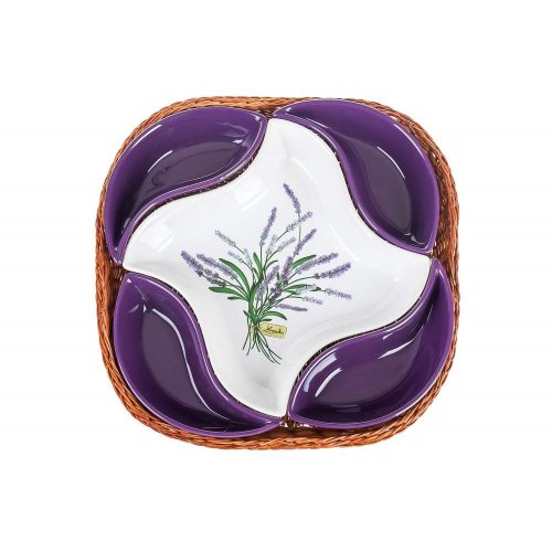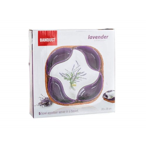 sada obsahuje: 4 x malá fialová keramická miska 1 x velká keramická miska s dekorem levandule 1 x proutěný košík