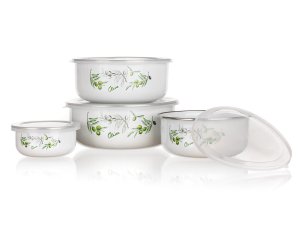 Sada smaltovaných misek s plastovými víky OLIVES. Misky jsou určeny pouze pro uchovávání potravin, nejsou určeny na vaření.