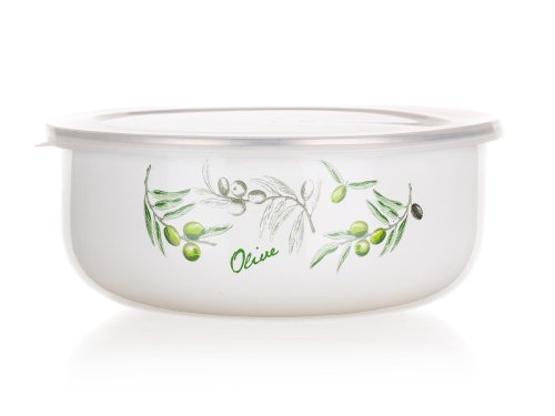 materiál: smalt, plastové víčko tloušťka stěny: 0,2 mm barva: bílá dekor: olivy